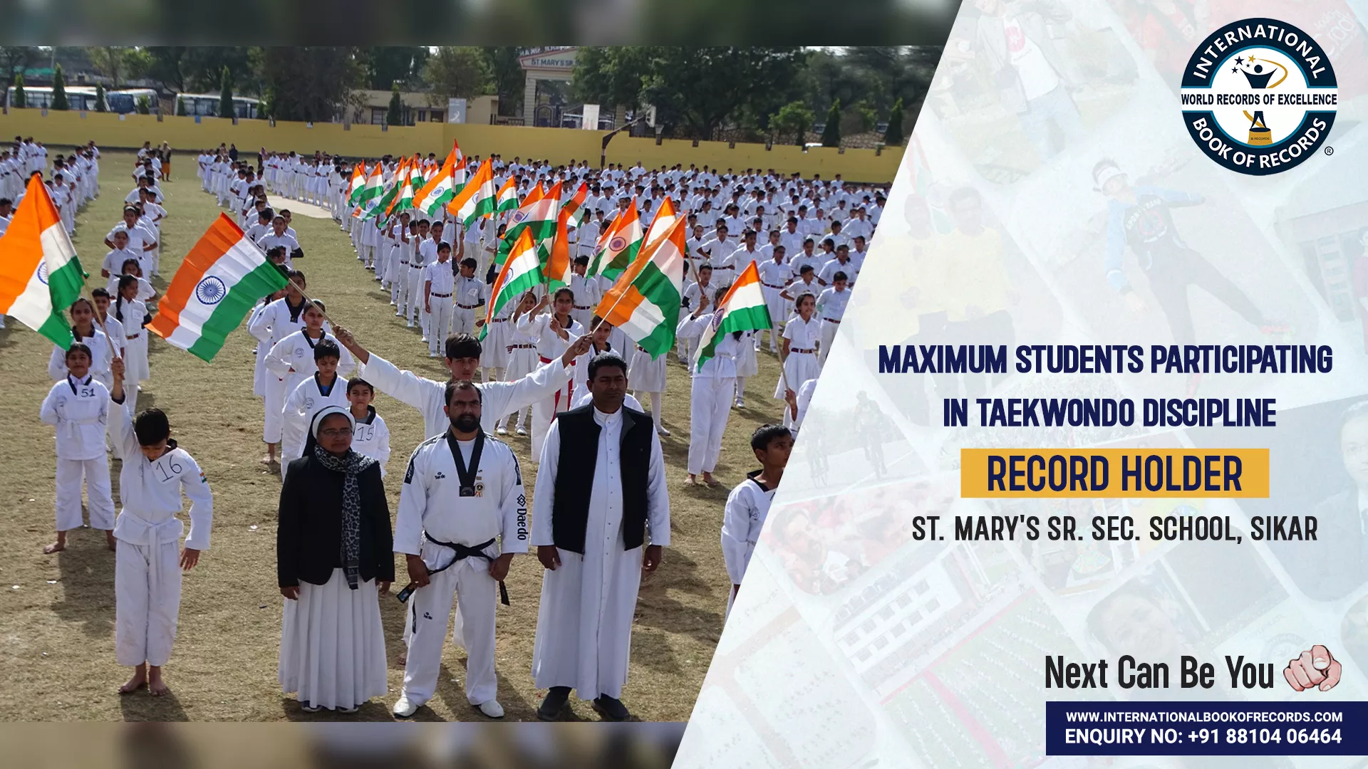 The World Record of “MAXIMUM STUDENTS PARTICIPATING IN TAEKWONDO DISCIPLINE” was achieved by ST. MARY'S SR. SEC. SCHOOL, SIKAR on 20th December 2023 from Sikar (Rajasthan) India. 1084 students participated in the Taekwondo Discipline, which was organized and managed by Mr. Jijo Parokkaran Poulose (manager) under the supervision of the school principal Reena Jose and trained by Taekwondo Coach Ajay Kumar and has set a new world record for International Book of Records.