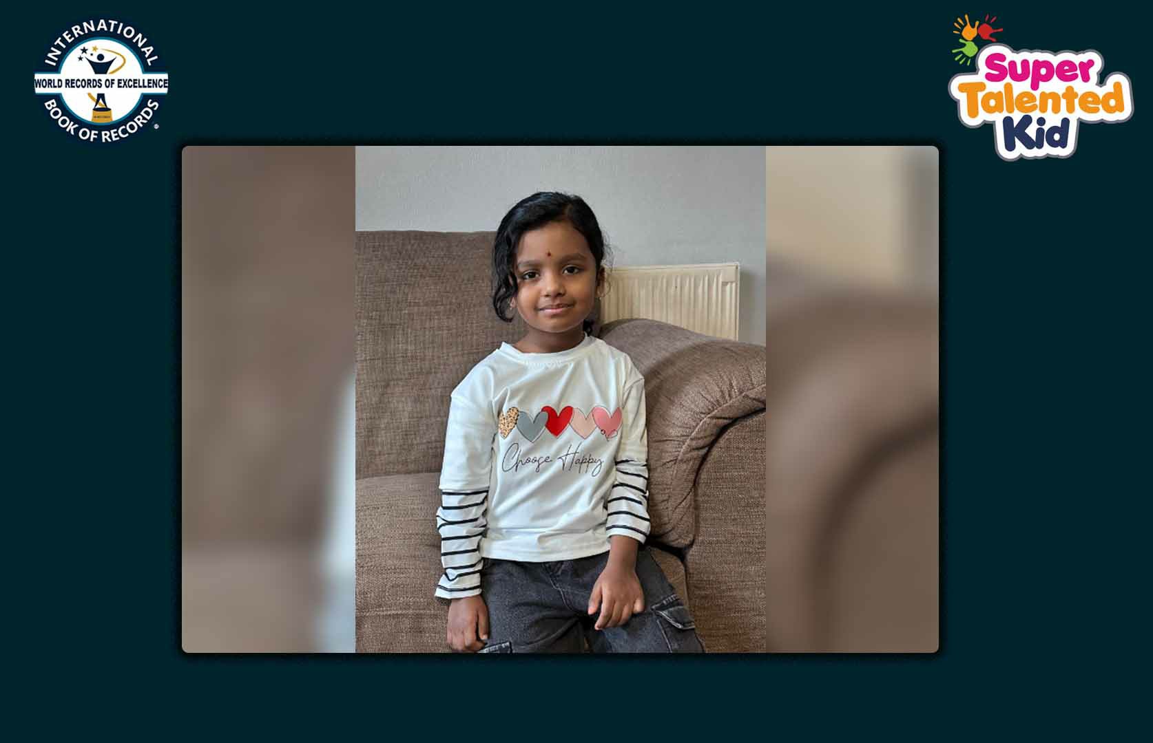Gauri Vishwakarma is a 2-year-4-month-old child from Katni, Madhya Pradesh, India. The young prodigy demonstrated remarkable skills by identifying and reciting shapes, English alphabets, wild animals, sea animals, nursery rhymes, punctuation mark, domestic animals, planet, and body parts. Thus, International Book of Records awarded her the title of “SUPER TALENTED KID” on 19th February 2026 and recognized her “ONE IN A MILLION.”